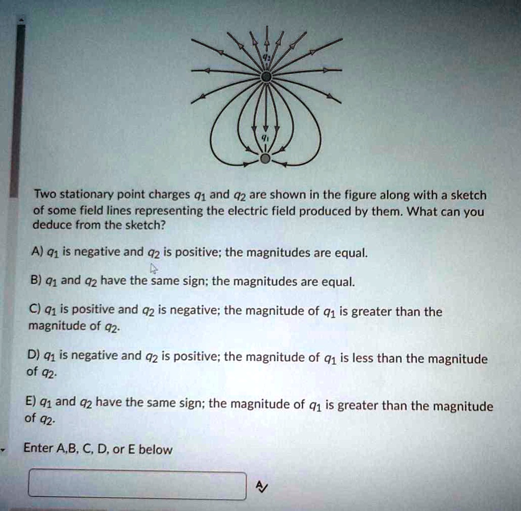 Two stationary point charges q1 and q2 are shown in the figure along with a sketch of some field lines representing the electric field produced by them. Two stationary point charges q1 and q2 are shown in the figure along with a sketch of some field lines representing the electric field produced by them. What can you deduce from the sketch.