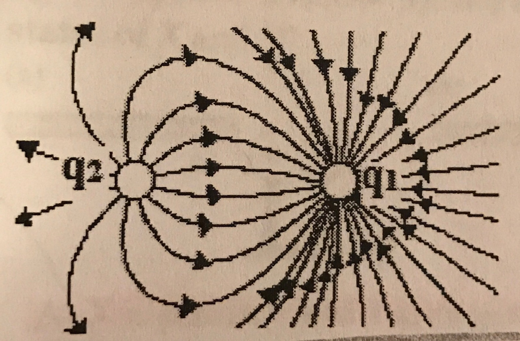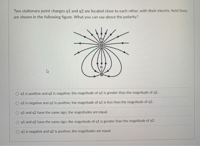 Now we are told that the electric field at point P is zero. B q1 and q2 have the same sign. Two charges located close to each other with field lines Group of answer choices in the picture q1 is negative and q2 is positive q1 is positive and q2 is negative.