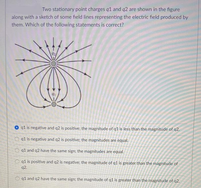The magnitude of q1 is less than the magnitude of q2. Two stationary point charges q1 and q2 are shown in the figure along with a. A q1 is positive and q2 is negative.