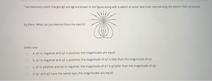 A What is the electric potential at a point midway between the charges. The magnitude of q1 is less than the magnitude of q2. Two stationary point charges q1 and q2 are shown in the figure along with a sketch of some field lines representing the electric field produced by them.